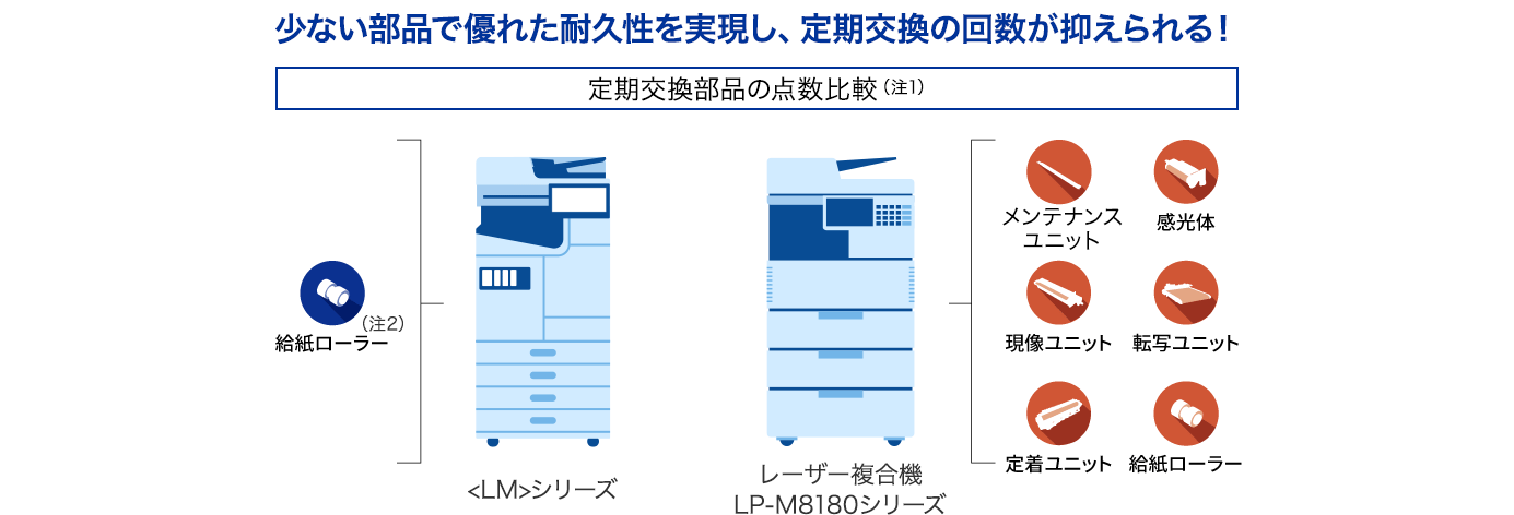 - (注1)月8,000枚で5年間、48万ページ使用したときの定期交換部品を提示。