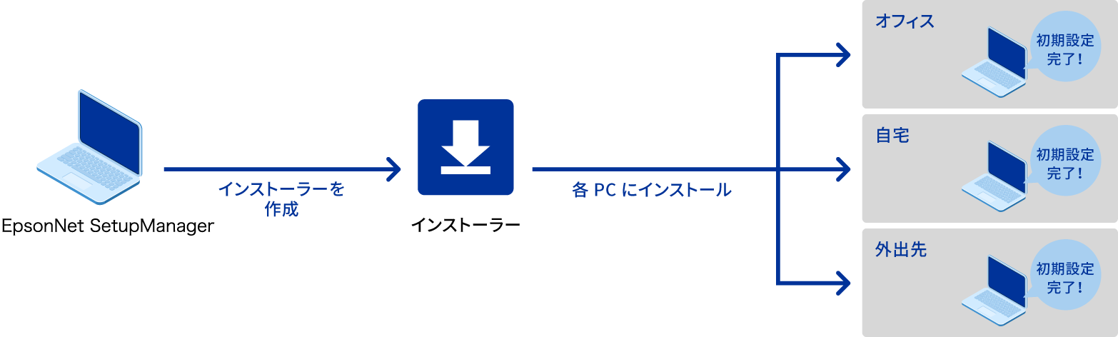 プリンタードライバー導入支援ツール「EpsonNet SetupManager」を活用すれば、IPや両面デフォルト設定など職場のルールに従って簡単に初期設定できるインストーラーを作成し、共有することで初期設定の手間を省けます。