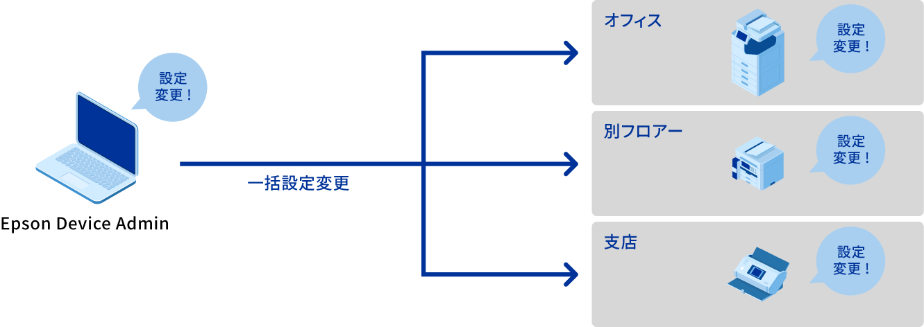 「Epson Device Admin」を活用すれば、ネットワーク上の機器をリモート操作で一括設定可能です。アドレス帳など、入れ替え前の機器情報も簡単に移行できます。