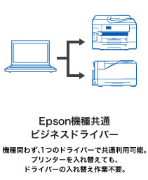 • Epson機種共通 ビジネスドライバー 機種問わず、1つのドライバーで共通利用可能。プリンターを入れ替えても、ドライバーの入れ替え作業不要。