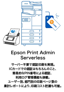 • Epson Print Admin Serverless サーバー不用で認証印刷を実現。ICカードでの認証はもちろんのこと、簡易的なPIN番号による認証、利用ログ管理機能も搭載。ユーザー別、部門別の印刷ページ数の集計レポートにより、印刷コスト把握も可能。