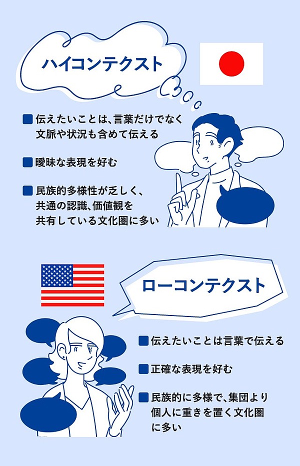 こうなってしまう要因の一つは、日本が「ハイコンテクスト」社会であること。民族の多様性が小さい日本は、価値観や慣習が似通っていることから、明確に言葉で表現しなくても相手の意図するところが分かってしまう。顔の微妙な表情や場の空気から、「察する」コミュニケーションが成立しやすいんです。