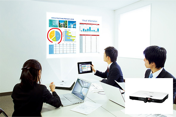 より高い機動性を持つ「モバイルモデル」も活用したい。プロジェクターらしからぬ薄型のモデルで、社内外を問わず持ち運べる。もちろんコンパクトなだけでなく、画面補正機能や色味の再現性に優れ、ワイヤレス機能も有していることから、さまざまなデバイスから投写できる点も強みだ。