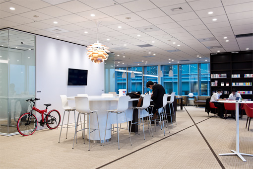 プロジェクター導入のきっかけとなったアビームコンサルティングの新拠点は、東京・千代田区にある丸の内永楽ビルディングの3フロア(1フロア約1000坪)に及び、東京エリアの全社員を集約する規模である。5つのオフィスをまとめたことで面積を圧縮し、賃料も抑えるなどの効率化を実現している。また、移転に要した期間は、デザイン・施工業者決定からわずか4ヵ月余り。まさにプロフェッショナルの仕事であるが、ファシリティマネジメントで重要なのはコミュニケーションであるという。「ファシリティマネジメントは経営戦略の一手段ですから、経営陣の考えをオフィスに落とし込むことが大切です。思惑とズレがないかを常に気をつけて、手戻りが出ないようにすることを常に意識しています」と津田氏。また、経営陣の判断をあおぐためには数字で示すことが重要で、例えば会議室の規模を決める場合は、現状の稼働率や集約による削減率を示して判断してもらうというわけである。
