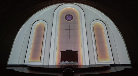 今回の空間演出に採用した商品はレーザー光源プロジェクター「EB-L1755U」および超短焦点ゼロオフセットレンズ「ELPLX02」。ホテルフランクスの約800インチ相当のチャペル内壁面に、ステンドグラスをイメージしたプロジェクションマッピングを投写した。