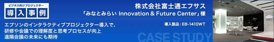 トータルサービスのリーディングカンパニーである株式会社富士通エフサスは、人材育成とイノベーションの場として「みなとみらい Innovation & Future Center」を2013年6月に開設した。同施設は、社外の人々も利用できるフューチャーセンターと研修センターを融合させたもので、エプソンのインタラクティブプロジェクター「EB-1410WT」33台を導入。社会貢献に向けたイノベーションと新サービス創出のためのツールとして、「EB-1410WT」を活用する現状と効果について人財総務本部 人材開発統括部 研修部の佐野弘典氏と妻木彰吾氏に伺った。
