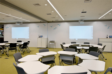 同センター内の主要施設は、大規模なイベントに使える「Camping Studio」、研修や会議など多目的に使える「Studio“TOPOS”」、ICT機器の保守教育等を行う「Fureken Lab」。上記の他、研修室や会議室等も含めて「EB-1410WT」を計33台設置、アナログホワイトボード・壁面に投映する形で使用している。なお、会議室などスライディングウォールでレイアウトを変えられる部屋には、「EB-1410WT」ボードスタンドタイプを導入している。