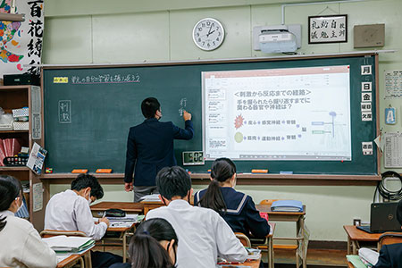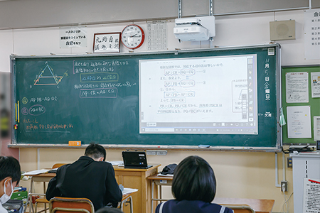 教室内でオンラインを使い、校外のゲストによる進路学習の出前授業や海外との交流学習、研修会などを行なったり、コロナ禍での休校時や感染者が出た際の学級閉鎖などでは、プロジェクターを使って家庭にいる生徒に向けてオンライン授業を実施。また、感染不安の生徒や不登校児への対応としても常に教室の授業のオンライン中継を行っています。さらに新型コロナウイルスへの感染対策として、全校集会や始業式・終業式などもオンラインで実施しています。