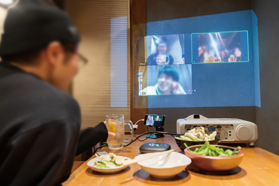 「ひないや」個室内にて、東京・大阪・山口の3拠点を繋いだオンライン飲み会の様子。スマートフォンをプロジェクターとスピーカーに繋ぐだけで、すぐそこで喋っているかのような臨場感のあるオンライン飲み会が楽しめます。