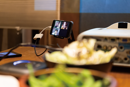 「ひないや」では10月初旬からオンライン飲み会プランをスタート。換気された個室でオンライン飲み会ができるように環境を整え、告知はSNSと店頭にポップを掲示して行いました。「初めて店舗でプロジェクター使ってみて、とにかく映像の綺麗さに感動しました。最近は手のひらサイズのプロジェクターも出ていますが、これは明るさが格段に違うように感じます。また、投影用のスクリーンが必要かと思っていましたが、普通の壁にもくっきりと映ることに驚きました。機材を色々と調達しなくていいのは助かりますね」と話す吉田さん。通常の照明の下でも映像が綺麗に映ることは、お客様にも好評だと言います。