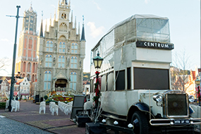 プロジェクターは、お客様に違和感を与えないように広場に配置したバスの2階に設置されている。