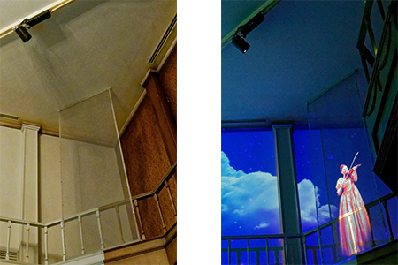 中二階の一部に透過型スクリ-ンを配し、天井にEV-105を設置。右の写真のように透過型スクリーンに人物の映像を投写することで、立体感のある映像演出を可能にした。