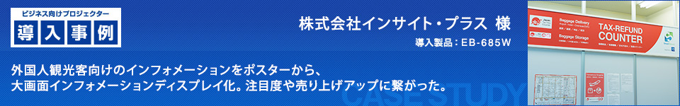 株式会社インサイト・プラスは、訪日客の方々の免税手続きを「街ごと」「ビルごと」といった単位で一括化し、時間と手間を省くサービスを中心に展開。荷物のトラフィックなども請け負うなど、より快適に日本の旅やビジネスシーンを楽しんでいただくことを目的としている。その外国人向けのインフォメーションディスプレイに、エプソンのEB-685Wを採用。その効果などを同社の八木岳郎さんに伺った。