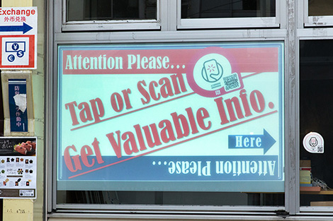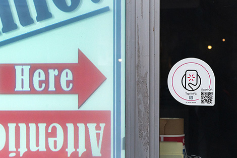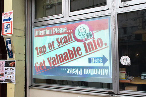 表示の横に二次元バーコード入りのステッカーを掲示。スマホなどで読み込むことで、クーポンなどを入手できる仕組みになっている。