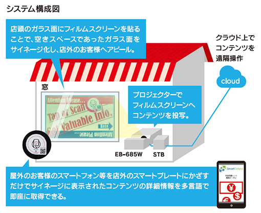 そんな折、東日本電信電話会社(NTT東日本)さまより、『“店舗のガラス面を活用した連動型クラウドサイネージならびに“画像認識AI”を用いた訪日外国人観光客向け「飲食店プロモーション」の実証実験』というプロジェクトに協力してほしいというお話をいただき、協力させていただくことに致しました。この実験では、店舗にある既存のガラス窓にスクリーンフィルムを貼り付けて、NTT東日本のクラウドサイネージサービスや画像認識AIサービスなどを活用し、エプソンのプロジェクターでスクリーンに投写するというものです。