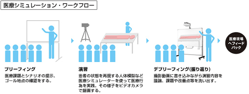 医療シミュレーションは、まずブリーフィングでテーマを提示して、その医療行為に際して、10人前後のチームがどのように動くかを検討する。そして、シミュレーターを使った演習で行動に移し、最後に、演習の動画を見ながらデブリーフィングで検証するという流れになっている。デブリーフィングは、講師役のインストラクターが舵取りをするのではなく、受講生が主体となってアナログホワイトボード周辺に集まり、事前に想定したゴールに到達できたかどうかを自分たちで討論している。