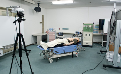 医療シミュレーションの研修では、センター室内に疑似病室を組み立てて演習を行う。医療設備が多いため、ITやAV機器は少しでも少なくして効率化を図った。