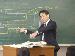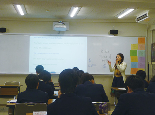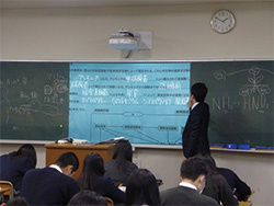 「電子黒板を導入したことで、生徒と教員の双方に活用効果を実感している」と語るのは、英語科の森川教諭。デジタル教材を黒板上に直接投影することで、従来の板書時間を大幅に削減ができた。そして、投写面上に、チョークで直接書き込みができ、黒板全面を活用できるので、従来の板書スタイルを崩さず、分かりやすい授業を実現できている。