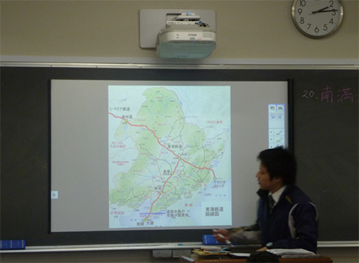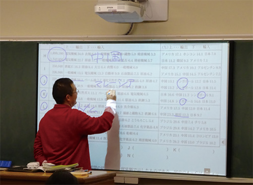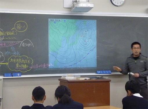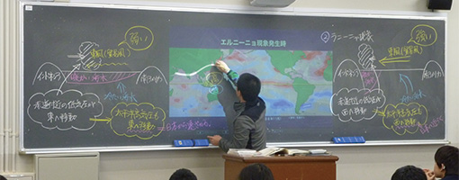 電子黒板から投写された地図などの資料上に、偏西風の流れなどをチョークで直接書き込みを行うことで、生徒の視覚に訴える効果がある。