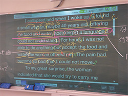 導入以前は、授業中に、すべての本文を板書することは困難であり、ポイントとなる文節のみしか板書ができなかった。導入後は、教材を瞬時に提示することができ、その上に直接チョークで書き込みすることができるので、従来の授業スタイルを維持しながら効率化が図られている。