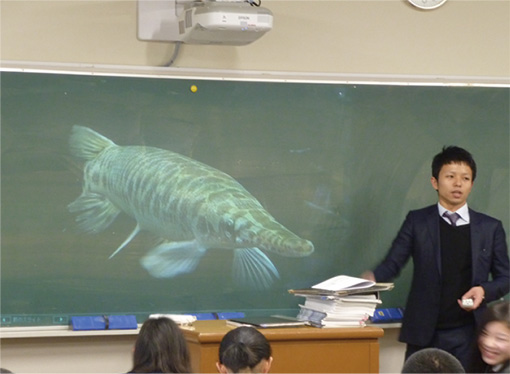 食物連鎖について、具体的な生物の映像を大きく映して説明を行うことにより、テーマに対する生徒の興味を掻き立てる。結果、授業の理解度が向上する。