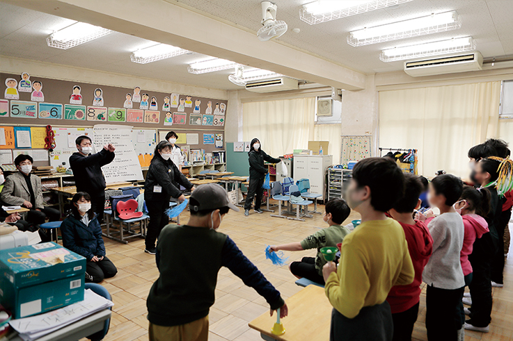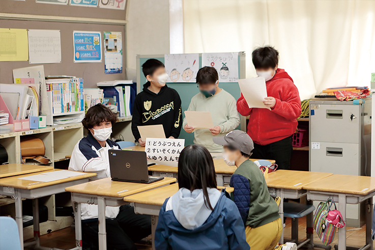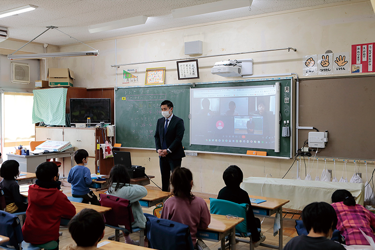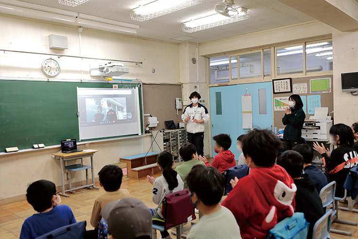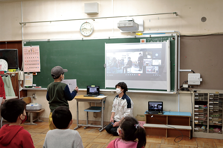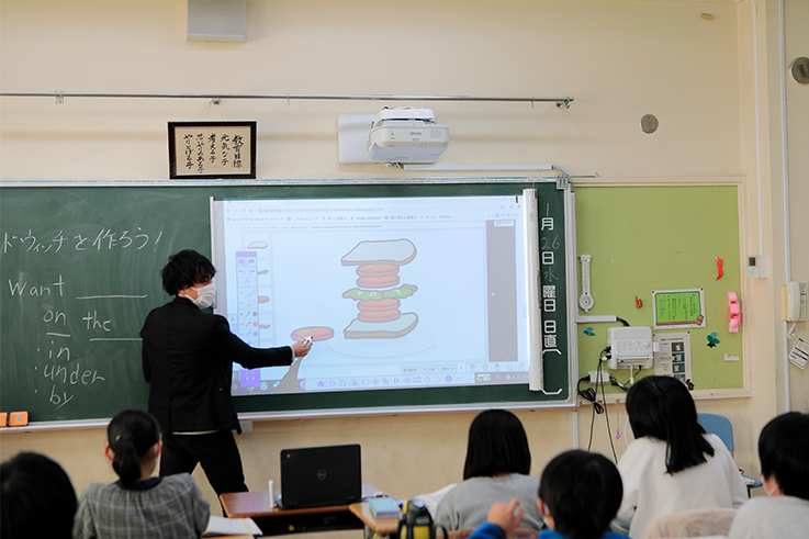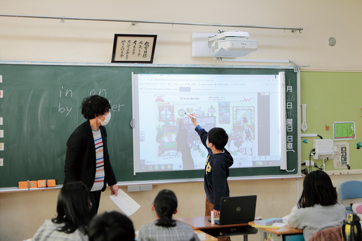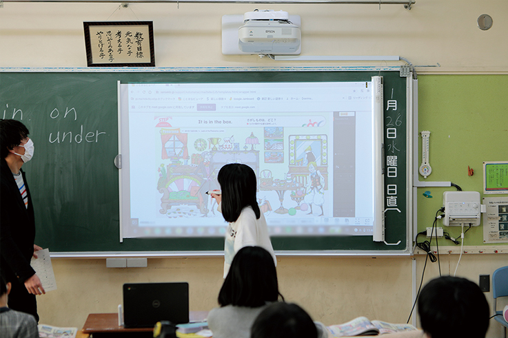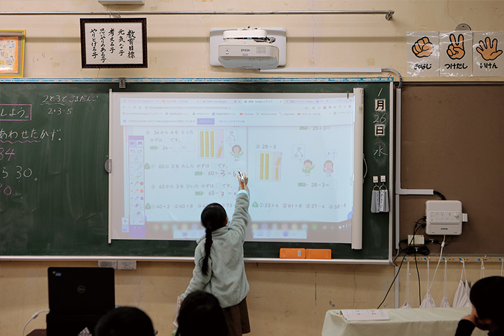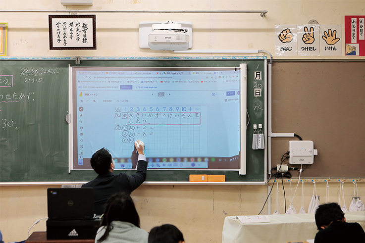 現在、電子黒板とChromebook™、デジタル教科書やGoogle WorkSpace for Educationなどの積極的なICT活用により、子供たちに分かりやすい授業を行うとともに、「主体的・対話的で深い学び」に向けた「個別最適化された学習モデルの構築」に取り組んでいます。