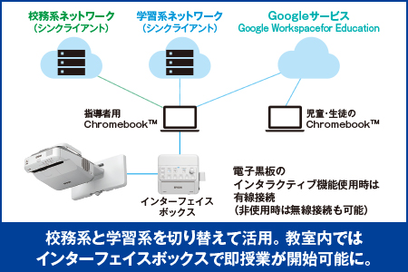 ICT機器については、2017年度から市内全小中学校にエプソンの電子黒板とChromebook™の導入を開始。GIGAスクール構想に伴い、さらに児童・生徒一人1台のChromebook™と各教室の無線ネットワーク整備を進め、2021年4月からは全学校の授業で利用を開始しています。