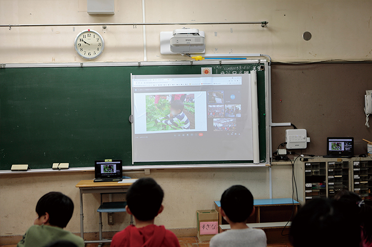 また、スライドで作成した教材や、子供たちがカメラ撮影した画像を使って休みの間の出来事やお気に入りの物を紹介したり、プログラミングアプリやスプレッドシートを使ったしりとり遊びの表示などにも利用しています。教材制作では、二次元コードやテキストリンクでWEBやアプリに誘導して、視覚・聴覚を刺激できるよう工夫したり、授業の様子を動画で記録してGoogle Classroom™を通じて家庭向けに発信したりもしています。