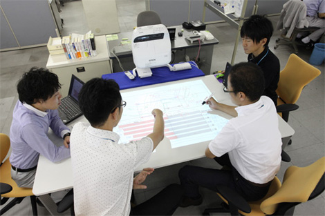 その頃組織改変があり、部門機能強化のため、双方向の議論が活発にできるツールの検討を始めた。2012年12月のことである。翌13年1月、エプソンのウェブサイトでEB-1410WTを知り、興味を持つ。2月には市内のショールームで実機を確認。使えそうだとの確信を得て導入を決定し、4月に利用を開始している。