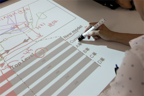 導入の理由について豊田氏は、「まず机上に投映できる点に注目しました。それを囲んで議論できるので、単なる報告で終わらないことが期待できました。また、投映したPCの資料に直接電子ペンで書き込みができ、それを保存できるのも魅力でした。投映する画像にはCAD図面が多いので、図面の細かい寸法や線が判読できる画質も重要でした。あとは、キャリブレーションが容易で明るい所で使用できる点も評価しました」と語っている。