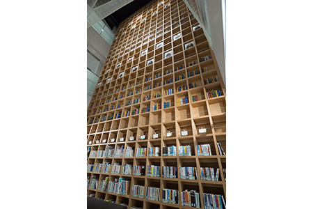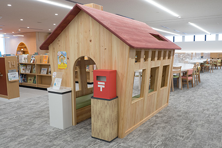 中野区立中野東図書館は、これまでにないコンセプトの下に創られる、新しく大規模な図書館ということで、所管する中野区教育委員会では、当館のシンボルとなるような設備を作りたいと考えていたといいます。そうした中で、実際に3つの設備の設置が実現しました。1つは、吹抜コーナー。もう1つは、こどもフロアに設置されたログハウスです。そして、3つめとして設置されたのが、子ども向けの読み聞かせスペース「こどものへや」です。