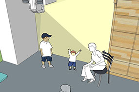 高輝度なEB-L1490Uに超短焦点ゼロオフセットレンズを組み合わせ、近距離での投写を実現(左と中央の写真)。機材を天井から吊るすことで、スクリーン付近で子どもたちが遊びまわっても光が目に直接入らず、壁面付近で読み聞かせを行う場合も眩しくないように工夫した(右のイラスト)。人物の影ができにくいため、投写した映像を背景にして記念写真を撮るといったことも可能だ。