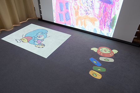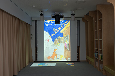 おはなし会で使用のほか、特別展やイベントなどに合わせたコンテンツも投写。取材時は、『ロシアの人たちが描いた新美南吉のお話「てぶくろをかいに」絵本表紙展』に合わせた映像が投写されていた(左の写真)。EV-100は床面投写のほか、プロジェクションマッピング的な使用法も可能(右の写真)。