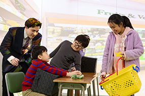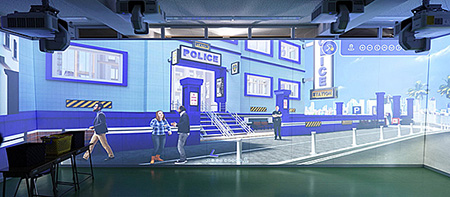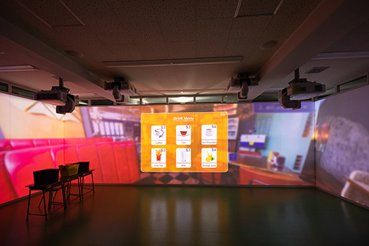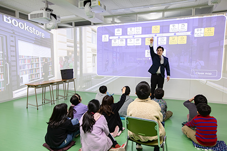 教室の3面のパーティションを活用したVR空間を用いることで、没入感・臨場感を演出し、児童が海外に行かなくてもリアルな状況での英語学習を実現できると考えたため。また、このような英語学習機会の中で、児童が、実際に英語でコミュニケーションを行うことで、「話せた!」という経験を積み、このことが自己肯定感の醸成につながると考えた。