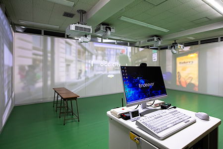 児童の健康面を考慮し一定の明るさでも鮮明に投映ができる点、限られた教室空間にて最大規格の投映を実現する点を重視し本製品を選定した。また、教室内に設置した3面のパーティションに関しては、没入感・臨場感の演出のため、映像に境界や区切りができないよう設営した。また、VRコンテンツを投映するためのパソコンは、VRコンテンツを授業内で使用する際、スムーズに投写できるよう高機能の製品が必要であったため「Endeavor MR8400」を選定した。
