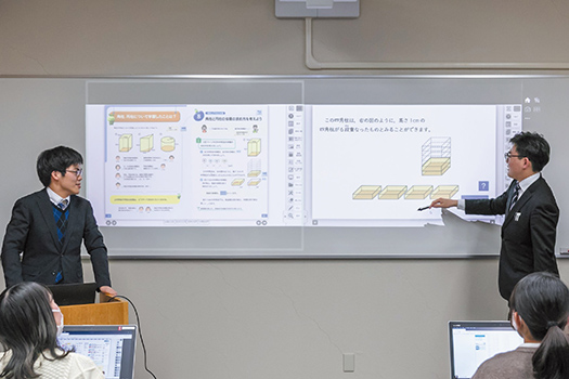 さらに12月には、ライブラリーホールに新設されたエプソンの電子黒板を使用して、上出研究室4年生による学部学生や教職大学院生への「指導者用デジタル教科書説明会」を実施。「EB-1485FT」の超ワイド投写の機能を使い、PC2台を接続した2画面表示でPowerPoint®の説明画面とデジタル教科書の操作画面を投写して説明を行い、受講者は1人1台のWindows®搭載PCやChromebook™を使用して実際の操作を体験しました。参加した学生からは「2画面でスライドと動作画面を同時に見れることは理解しやすいと感じた」と大変好評で、今後も電子黒板を利用した正規の講義での定期的な体験会や、活用コンテスト(年1回)などを企画しています。
