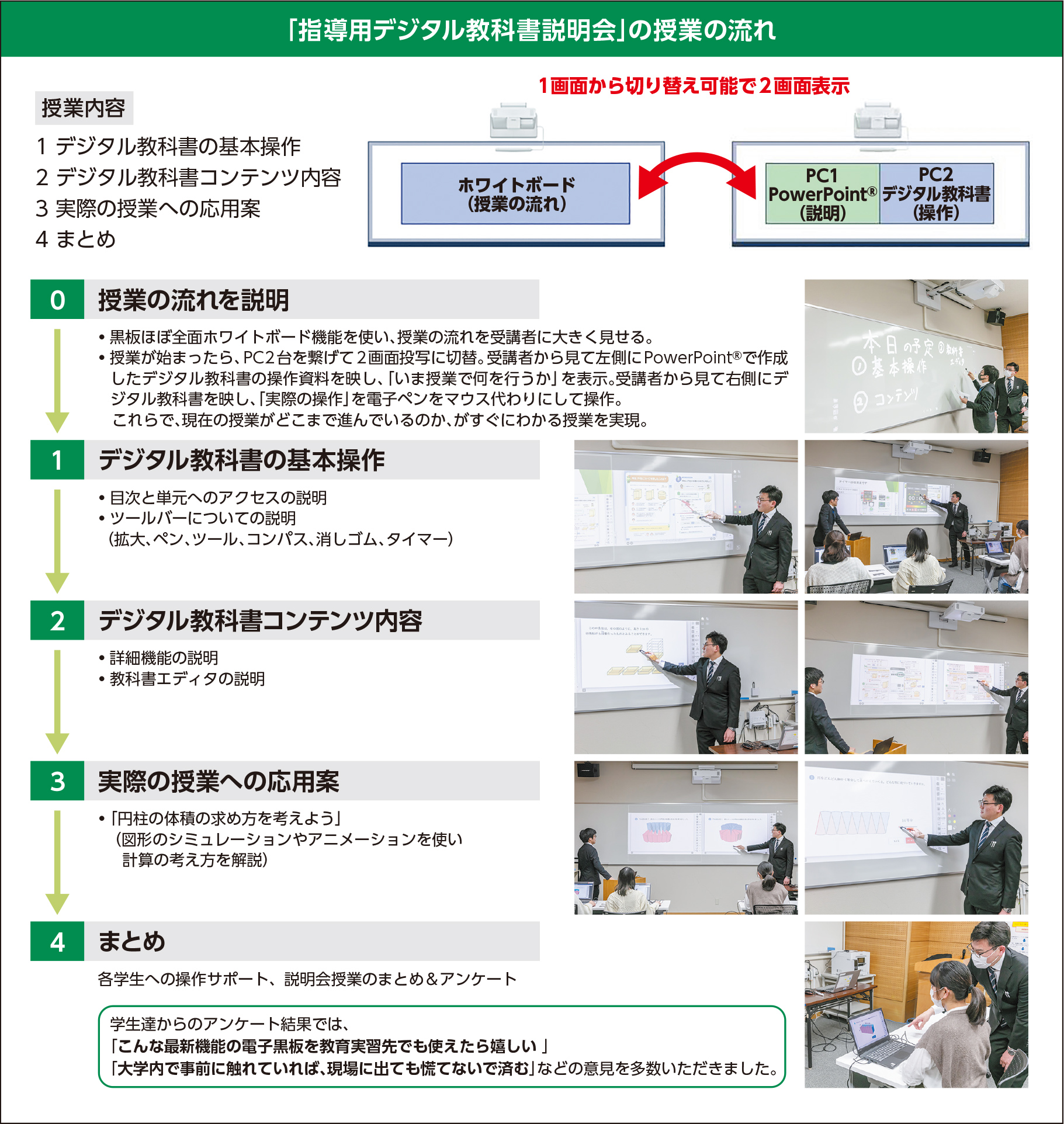 - デジタル教科書と電子黒板を使った授業の実践で学生のICT活用学習での指導力を強化