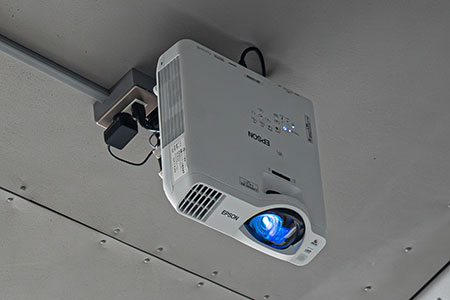 機材の選定では、候補は3社の製品がありましたが、軽さやサイズ、省電力性、明るさと短焦点レンズの採用、コストなどを総合的に比較した結果、エプソンのEB-L21OSWが一番適していると判断しました。特に省電力性については、施設の電源容量が決まっており、増やすには相応のコストがかかるため重要でした。