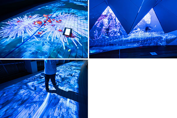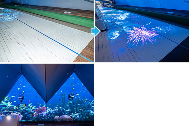 天井が連続した山型で、山型1つに1台ずつのブロジェクターを要したが、つなぎ目も自然で没入感のある映像演出ができた。(写真・右上)