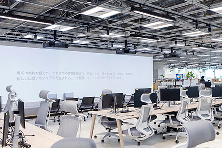 同社はオフィス移転に伴い、出社したいと思える環境づくりを検討。コロナ禍でリモートワークが増えたことを背景に、情報共有がしやすいオフィスサイネージの活用を考え、高輝度プロジェクターの導入に至ったとのことで、お話を伺いました。