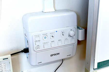 大型提示装置については、2017年度~2019年度にエプソンの電子黒板機能付プロジェクターEB-685WTを導入しました。機器選定にあたっては、据置型と壁掛型の短焦点プロジェクター、ディスプレイ型電子黒板の3タイプで比較検討しましたが、狭い教室内でも邪魔にならないことや、子どもが足を引っ掛けないよう安全性を重視して壁掛型を採用。