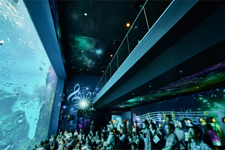 ただ、大水槽は屋根がなく自然光を取り入れる構造となっており、かなりの明るさがあることからどのように映像演出を行うかが課題で、試行錯誤した結果、水槽以外の壁面全体に映像を映し出して水槽を含めた全体の演出として、360°プロジェクションマッピングを行うこととなった。また建物の構造上、壁面を加工して機材を取り付けることができないため、展示室にタワーを組んで機材を配置する必要があり、そのタワーの位置も安全上の制約があるという限られた条件下でいかに投写するかも課題となっていた。