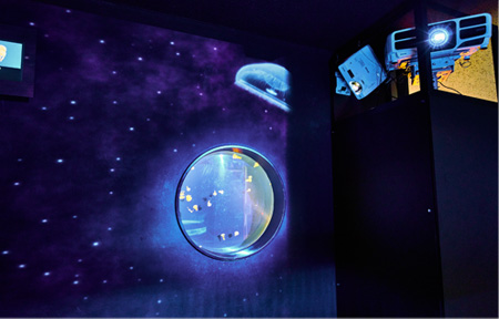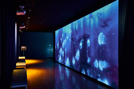 360°プロジェクションマッピング以外では、「クラゲのいやし」コーナーとそこに通じる通路である「コミュニケーションウォール」での映像演出にもプロジェクターを使用。センサー等を用いた、インタラクティブ性のある展示を目指した。この2ヶ所についても、やはり壁面などを加工することができないため、その設置方法も課題であった。
