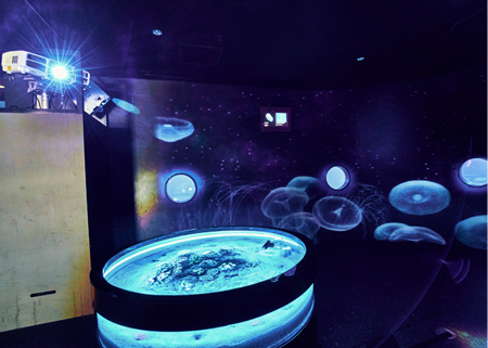 当初からプロジェクションマッピングを計画していたため、プロジェクター以外の映像機器を使用することは想定していなかったが、限られたスペースに配置する必要があるためと設置性やメンテナンス性などを考慮した結果、レーザー光源プロジェクターを中心に使用することとした。実際、大水槽での展示は天井などへの投写は本体を垂直に設置した状態となり、壁面への投写も仰角のついた状態となるため、レーザー光源プロジェクターEB-L1505Uほかの採用は正解であった。3LCD方式採用ということもあり、カラーの明るさは申し分なく、その上、他社製品と比べても小型・軽量であるため、設置や調整が行いやすかった。設置や調整を行うスタッフなどからも、その明るさや省スペース性に驚きの声が上がっていた。レンズは超短焦点のELPLU03を使用。1台で広いエリアをカバーすることができ、少ない台数でのプロジェクションマッピングを実現できた。「コミュニケーションウォール」では壁面タッチにより演出が変化するアクティブな空間を演出。本コーナーで使用した3400lmのEB-535Wは、省スペースでの短い投写距離に対応し、小型コンパク卜で柔軟な設置を可能とした。「月とクラゲのいやし」コーナーでは、床面を歩くと水面を歩いているような空間を演出。レーザー光源のEB-L1100Uを使うことで、コンパク卜でありながら十分な明るさと高コントラストの投写ができ、幻想的な空間を創出できた。