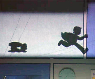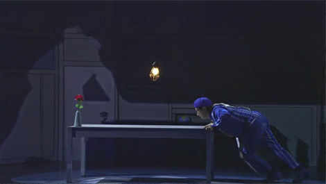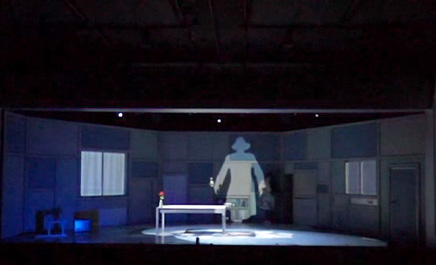 舞台上で主人公と映像により表現された影が戦うシーン。映像と役者の動きの連携により実現した、新しい映像表現となった。