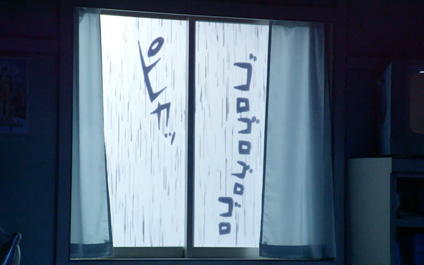 窓にオノマトペの映像を投影し、雷と雨の音を文字で表現。