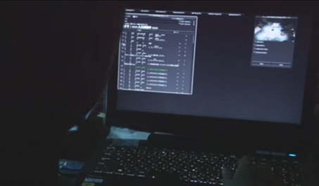 舞台上で主人公と映像により表現された影が戦うシーン。映像と役者の動きの連携により実現した、新しい映像表現となった。舞台上で主人公と映像により表現された影が戦うシーン。映像と役者の動きの連携により実現した、新しい映像表現となった。