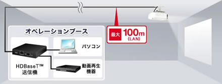 長距離での映像転送を可能にするHDBaseT™ インターフェイスを装備(注1)。受信側ユニットを内蔵しているので、導入コストを低減できます。