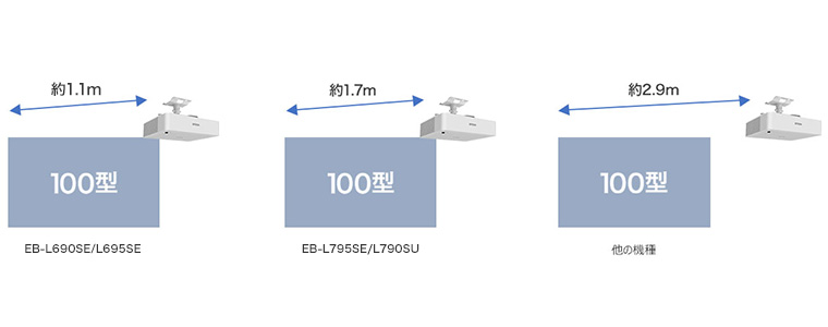 EB-L690SE/L695SEの100型の投写距離は約1.1m、EB-L795SE/L790SUは約1.7m(他の機種は約2.9m)。狭い場所・投写距離が確保できない場所でも大画面投写が可能です。