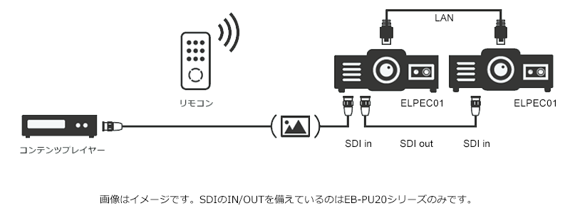 また、EB-PU20シリーズは、SDIのIN/OUTを備えているので2台のプロジェクターをデイジーチェーン接続することが可能です。スプリッター等の機器負担を減らしたシステム構築が可能となります。